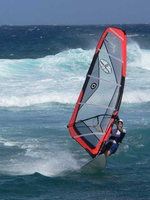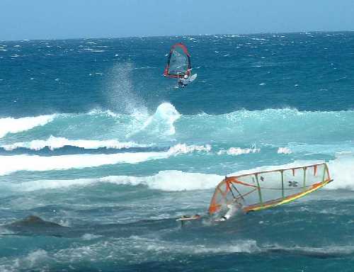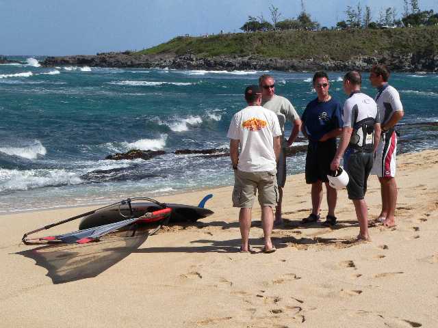 The guy in the forground wasn't so lucky, his kit survived but his legs bear the scars of Hookipa's rocks.