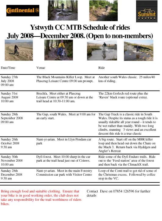 Ystwyth CC MTB ride Schedule for rest of 2008